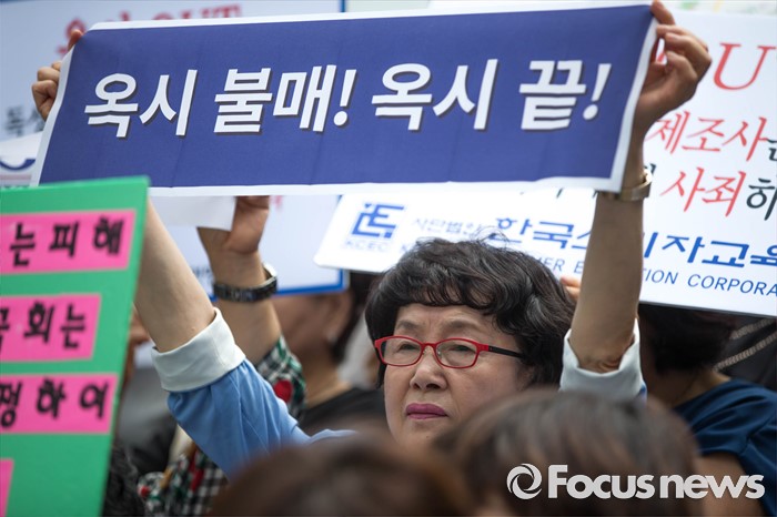 (서울=포커스뉴스) 13일 오전 서울 용산구 롯데마트 서울역점 앞에서 소비자단체 회원들이 롯데마트의 자사 가습기 살균제품 피해에 대한 책임있는 행동을 촉구하고 옥시 제품 판매 중단을 요구하는 집회를 하고 있다.