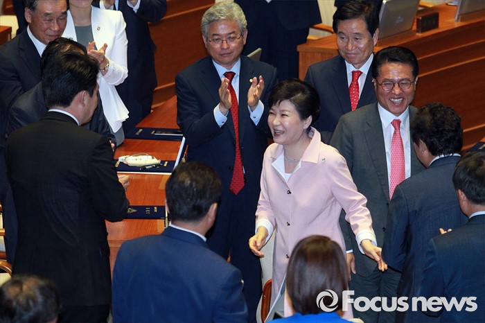 (서울=포커스뉴스) 박근혜 대통령이 13일 오전 서울 여의도 국회에서 열린 20대 국회 개원식에 참석해 연설을 마친 뒤 퇴장하며 의원들과 인사하고 있다.