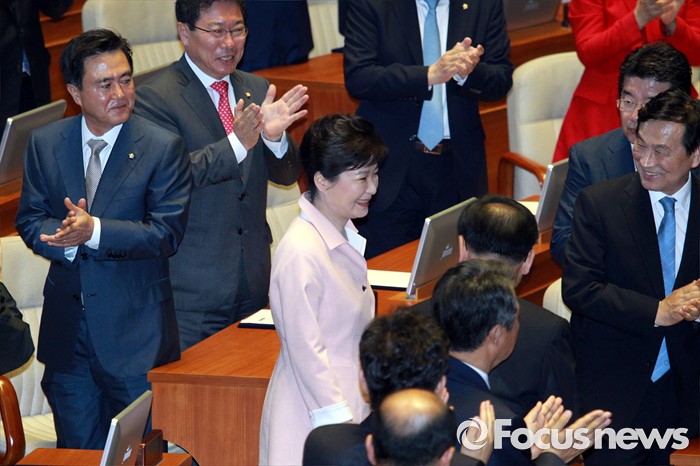 (서울=포커스뉴스) 박근혜 대통령이 13일 오전 서울 여의도 국회에서 열린 20대 국회 개원식에 참석해 의원들의 박수를 받으며 단상으로 향하고 있다.