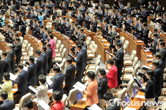 (서울=포커스뉴스) 13일 오전 서울 여의도 국회에서 열린 20대 국회 개원식에 참석한 의원들이 선서를 하고 있다.