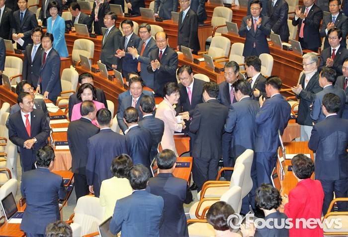 | △ 의원들과 인사하며 퇴장하는 박근혜 대통령 |