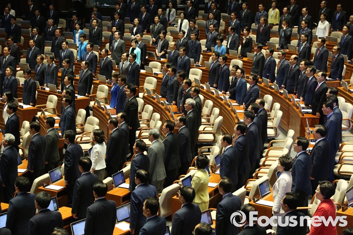 (서울=포커스뉴스) 13일 오전 서울 여의도 국회에서 열린 20대 국회 개원식에 참석한 의원들이 애국가를 제창하고 있다.