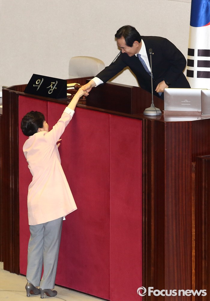 (서울=포커스뉴스) 박근혜 대통령이 13일 오전 서울 여의도 국회에서 열린 20대 국회 개원식에 참석해 연설을 마친 뒤 정세균 국회의장과 악수하고 있다.