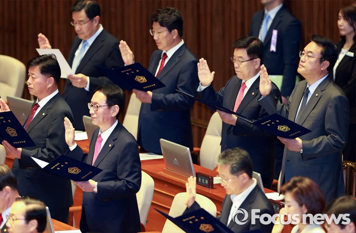 (서울=포커스뉴스) 13일 오전 서울 여의도 국회에서 열린 20대 국회 개원식에 참석한 정진석 새누리당 원내대표 등 의원들이 선서를 하고 있다.