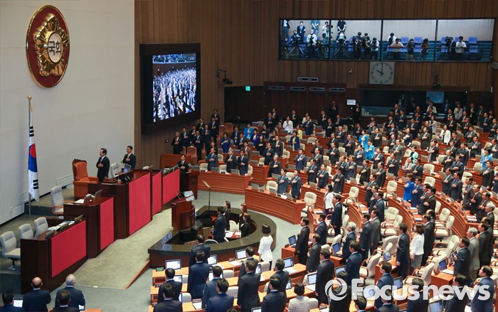 (서울=포커스뉴스) 13일 오전 서울 여의도 국회에서 열린 20대 국회 개원식에 참석한 의원들이 국기에 대한 경례를 하고 있다.