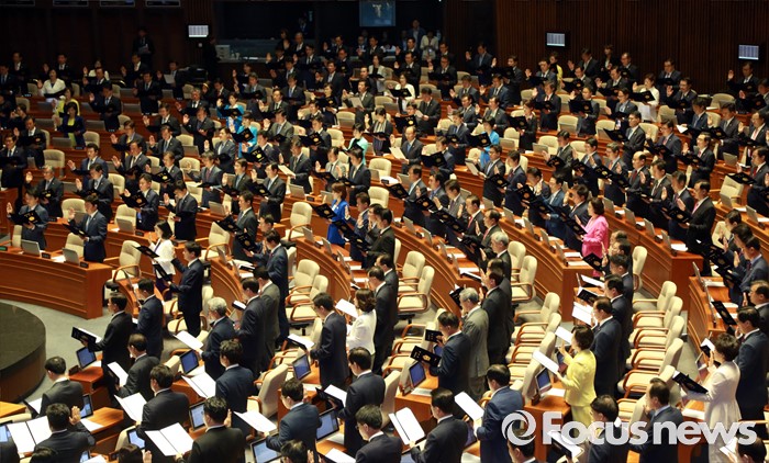 (서울=포커스뉴스) 13일 오전 서울 여의도 국회에서 열린 20대 국회 개원식에 참석한 의원들이 선서를 하고 있다.