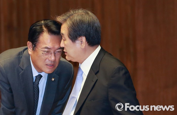 (서울=포커스뉴스) 김무성(오른쪽) 새누리당 전 대표와 정진석 원내대표가 13일 오전 서울 여의도 국회에서 열린 20대 국회 개원식에 참석해 대화하고 있다.