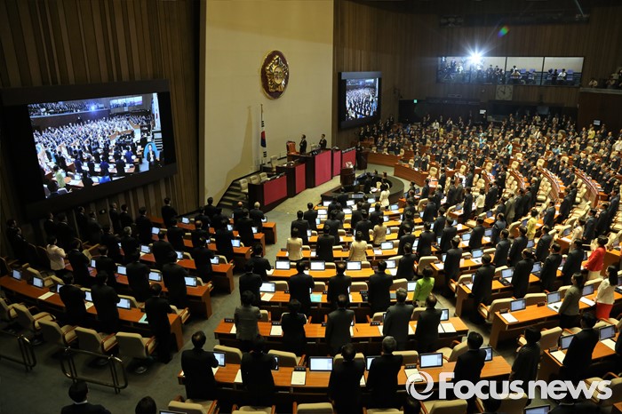 (서울=포커스뉴스) 13일 오전 서울 여의도 국회에서 열린 20대 국회 개원식에 참석한 의원들이 애국가를 제창하고 있다.
