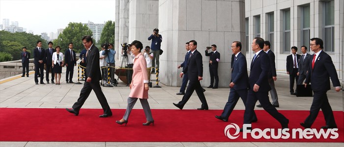 (서울=포커스뉴스) 박근혜 대통령이 13일 오전 서울 여의도 국회에서 열린 20대 국회 개원식에 참석한 뒤 본청을 나서고 있다.