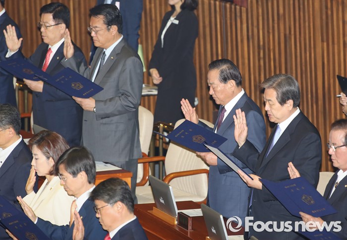 (서울=포커스뉴스) 13일 오전 서울 여의도 국회에서 열린 20대 국회 개원식에 참석한 김무성 새누리당 전 대표, 정진석 원내대표, 서청원 전 최고위원 등이 선서를 하고 있다.