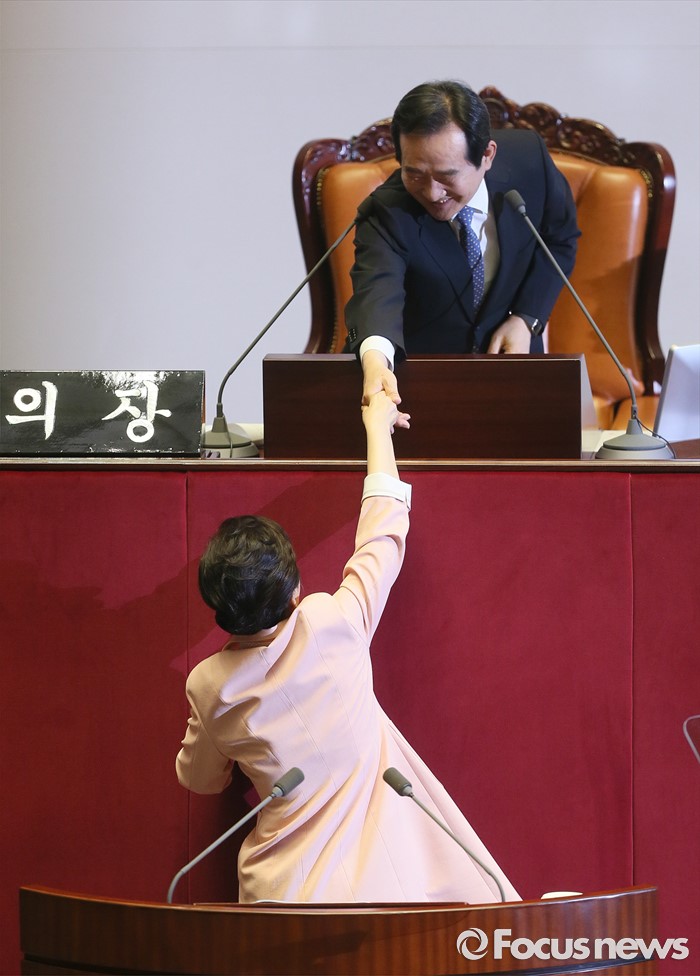 (서울=포커스뉴스) 박근혜 대통령이 13일 오전 서울 여의도 국회에서 열린 20대 국회 개원식에 참석해 연설을 마친 뒤 정세균 국회의장과 인사하고 있다.