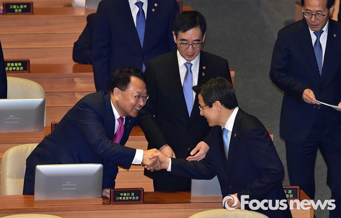 (서울=포커스뉴스) 황교안(오른쪽) 국무총리와 유일호(왼쪽) 경제부총리 겸 기획재정부 장관이 13일 오전 서울 여의도 국회에서 열린 20대 국회 개원식에 참석해 인사하고 있다. 가운데는 이준식 사회부총리 겸 교육부 장관.