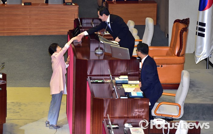 (서울=포커스뉴스) 박근혜 대통령이 13일 오전 서울 여의도 국회에서 열린 20대 국회 개원식에 참석해 연설을 마친 뒤 정세균 국회의장과 인사하고 있다.