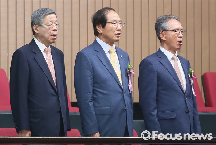 (서울=포커스뉴스) 13일 오전 서울 여의도 국회에서 열린 20대 국회 개원식에 참석한 김희옥(왼쪽부터) 새누리당 혁신비대위원장, 신경식 헌정회장, 김형오 전 국회의장이 애국가를 부르고 있다.