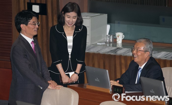 (서울=포커스뉴스) 13일 오후 서울 여의도 국회에서 상임위원장 선출을 위해 열린 343회 국회(임시회) 2차 본회의에 참석한 김종인(오른쪽부터) 더불어민주당 비대위 대표, 박경미 의원, 박완주 원내수석부대표가 대화하고 있다.