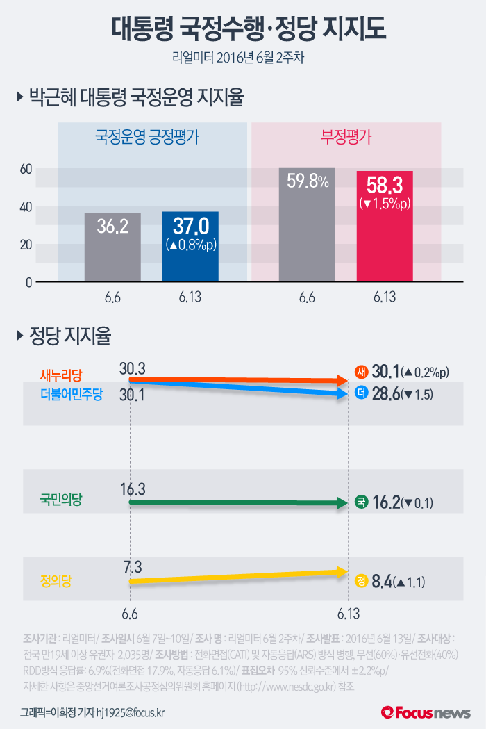 (서울=포커스뉴스) 여론조사 전문기관 리얼미터가 13일 발표한 6월2주차 주간집계 여론조사 결과에 따르면박근혜 대통령의 국정수행에 대한 지지도(긍정평가)는 지난주 대비 0.8%p 오른 37.0%로 나타나 5월3주차(32.3%) 이후 3주 연속 상승했다.