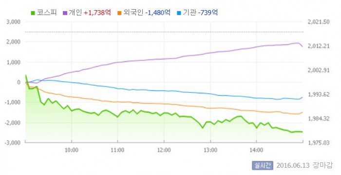 증시 전문가들은 "미 FOMC와 브렉시트(Brexit·영국의 유럽연합 탈퇴), 중국 A주의 모건스탠리캐피탈인터내셔널(MSCI) 신흥지수 편입 등 글로벌 이벤트를 앞두고 닷새 만에 2000선 아래로 주저 앉았다"고 진단했다.