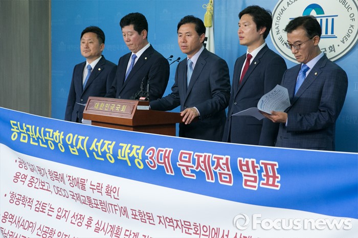 (서울=포커스뉴스) 13일 오후 서울 여의도 국회 정론관에서 더불어민주당 부산지역 의원들이 동남권 신공항 입지 선정 과정 문제점 발표 기자회견을 하고 있다. 왼쪽부터 최인호, 박재호, 김영춘, 김해영, 전재수 의원.