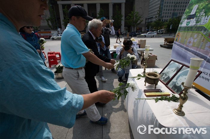 (서울=포커스뉴스) 2002년 미군 궤도차량에 치여 숨진 고(故) 신효순·심미선 양 14주기인 13일 오후 서울 종로구 광화문 광장에 마련된 분향소에서 참가자들이 헌화하고 있다.