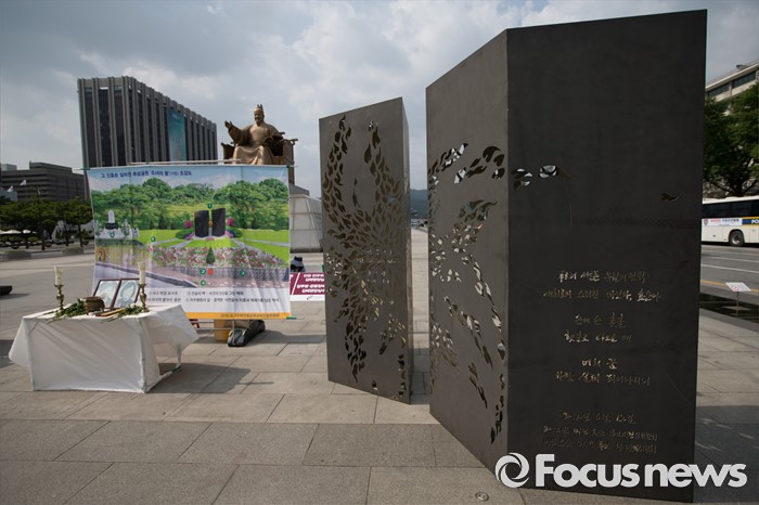 (서울=포커스뉴스) 2002년 미군 궤도차량에 치여 숨진 고(故) 신효순·심미선 양 14주기인 13일 오후 서울 종로구 광화문 광장에 마련된 분향소와 추모비 '소녀의 꿈'.
