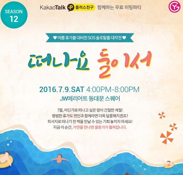 가연 이벤트팀 담당자는 "이성을 만날 기회도 없고, 더 이상의 소개팅을 부탁하기도 미안한 결혼 적령기 카카오톡 플러스 친구를 위해 준비한 자리"라며 "피서지로 떠나기 전 짝을 만날 수 있는 기회를 놓치지 않았으면 좋겠다"고 말했다.미팅파티 '떠나요 둘이서' 개최를 알리는 포스터.<사진제공=가연>