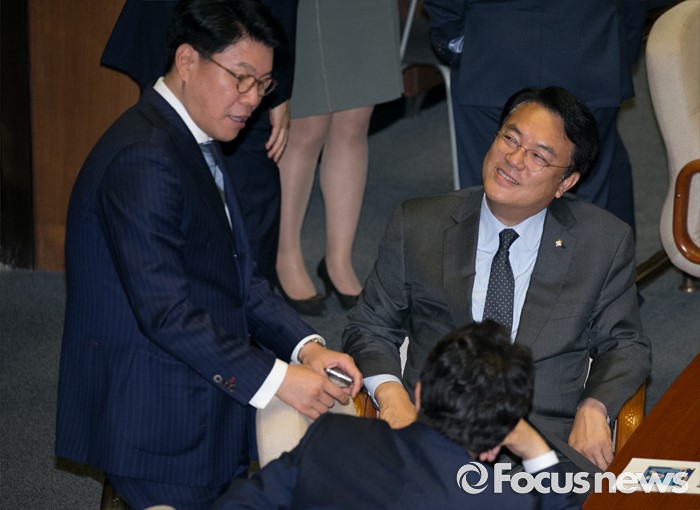 (서울=포커스뉴스) 13일 오후 서울 여의도 국회에서 상임위원장 선출을 위해 열린 343회 국회(임시회) 2차 본회의에 참석한 정진석(오른쪽) 새누리당 원내대표와 장제원(왼쪽) 무소속 의원이 대화하고 있다.