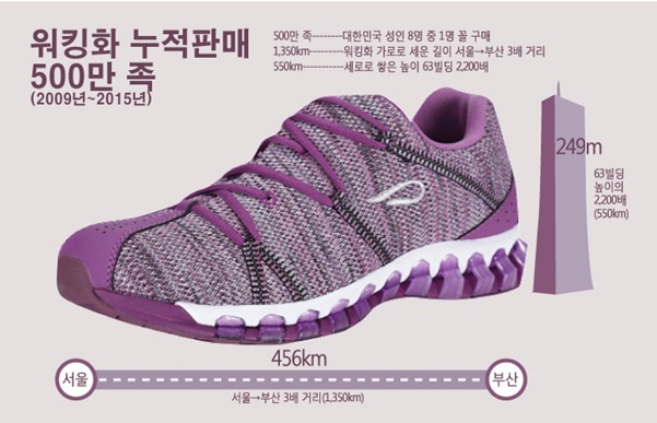 지금까지 판매된 워킹화를 일렬로 세우면 서울에서 부산까지 거리의 3배인 1350km에 달하고, 높이로 치면 여의도 63빌딩의 2200배에 달하는 550km에 해당한다(270mm 사이즈, 높이 11cm 기준).