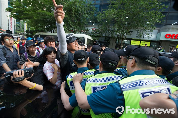 | △ 행진 도중 경찰과 대치하는 집회 참가자 |