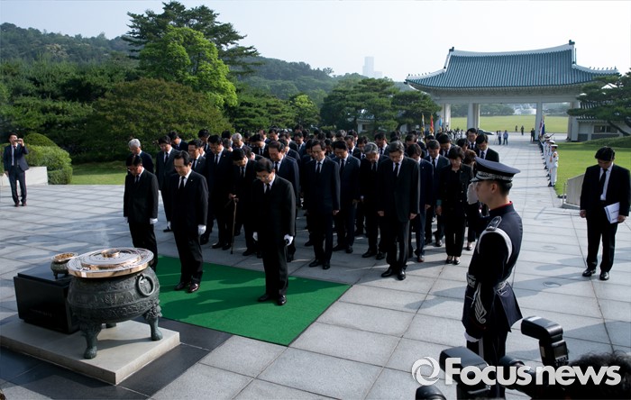 (서울=포커스뉴스) 정세균 국회의장이 14일 오전 동작구 국립서울현충원을 방문해 여야 3당 원내대표, 20대 국회 전반기 상임위원장단과 함께 참배를 하고 있다.