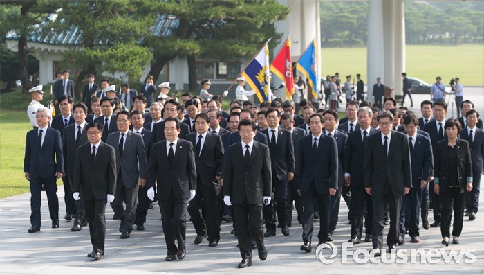 (서울=포커스뉴스) 정세균 국회의장과 정진석 새누리당 원내대표, 우상호 더불어민주당 원내대표, 박지원 국민의당 원내대표, 20대 국회 전반기 상임위원장들이 14일 오전 동작구 국립서울현충원을 방문해 참배를 위해 이동하고 있다.