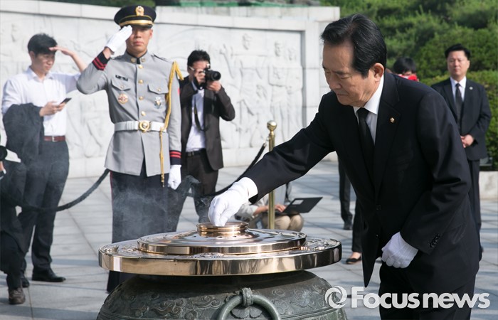 (서울=포커스뉴스) 정세균 국회의장이 14일 오전 동작구 국립서울현충원을 방문해 여야 3당 원내대표, 20대 국회 전반기 상임위원장단과 함께 참배를 하고 있다.
