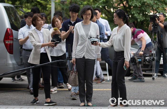 (서울=포커스뉴스) 미공개 정보를 이용해 주가하락 손실을 피한 혐의를 받고 있는 최은영 전 한진해운 회장이 14일 오전 서울 양천구 남부지방법원에서 영장실질심사를 받기 위해 법정으로 향하며 취재진 질문을 받고 있다.