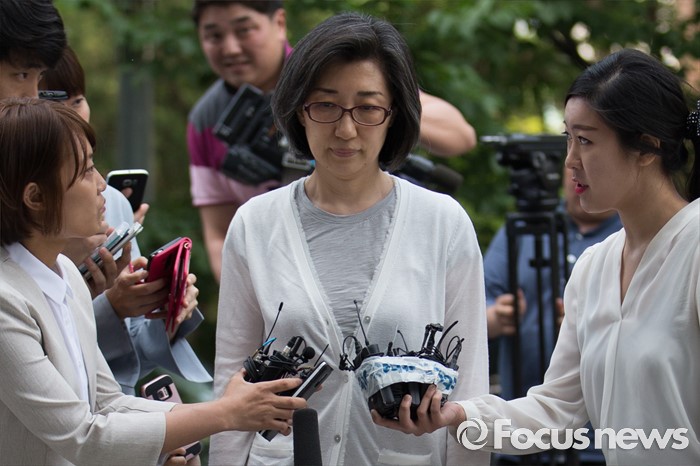 (서울=포커스뉴스) 미공개 정보를 이용해 주가하락 손실을 피한 혐의를 받고 있는 최은영 전 한진해운 회장이 14일 오전 서울 양천구 남부지방법원에서 영장실질심사를 받기 위해 법정으로 향하며 취재진 질문을 받고 있다.