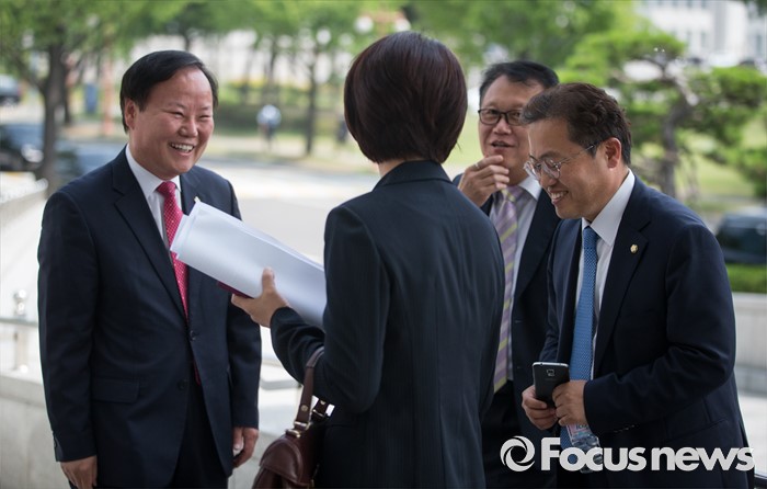 (서울=포코스뉴스) 김재원 청와대 정무수석이 14일 오후 서울 여의도 국회 의원회관 앞에서 의원들과 인사를 나누고 있다.