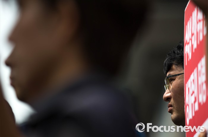 (서울=포커스뉴스) 14일 오전 서울 종로구 세종문화회관 앞에서 양대노총 공공부문공대위가 주최하는 '성과연봉제 중단 촉구 및 공공기관장 워크숍 규탄 기자회견'이 열리고 있다.