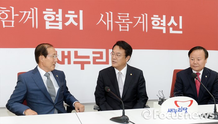 (서울=포커스뉴스) 정진석(가운데) 새누리당 원내대표가 14일 오전 서울 여의도 국회를 방문한 이원종(왼쪽) 대통령비서실장, 김재원 청와대 정무수석과 면담을 하고 있다.