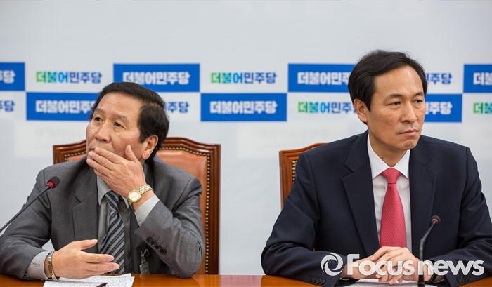 (서울=포커스뉴스) 우상호(오른쪽) 더불어민주당 원내대표와 정기섭 개성공단기업협회 회장이 14일 오전 서울 여의도 국회에서 열린 '개성공단기업협회 간담회'에 참석 하고 있다.