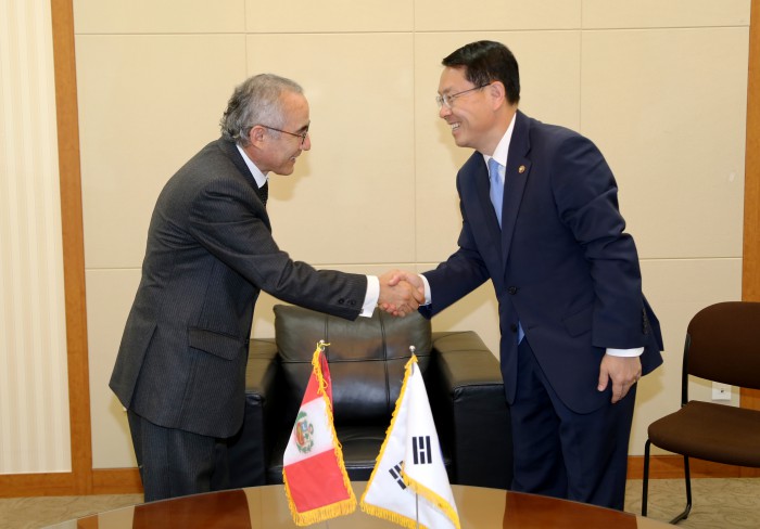 (세종=포커스뉴스) 천홍욱 관세청장은 13일 대전컨벤션센터에서 열린 중남미 고위급 초청세미나를 통해 미겔 아르만도 슐카 몬헤(Miguel Armando Shulca Monge) 페루 관세청장과 양자면담을 개최했다. 이날 양 국은 한·페루 세관상호지원협정 체결 및 성실무역업체 상호인정약정(AEO MRA) 협력에 관해 논의했다. 아울러 양 국 청장은 페루 세관공무원 초청연수 등 양 관세당국 간 주요 현안에 대한 의견도 교환했다.13일 천홍욱 관세청장(사진 오른쪽)이 대전컨벤션센터에서 미겔 아르만도 슐카 몬헤(Miguel Armando Shulca Monge) 페루 관세청장과 만나 악수를 나누고 있다. <사진=관세청>