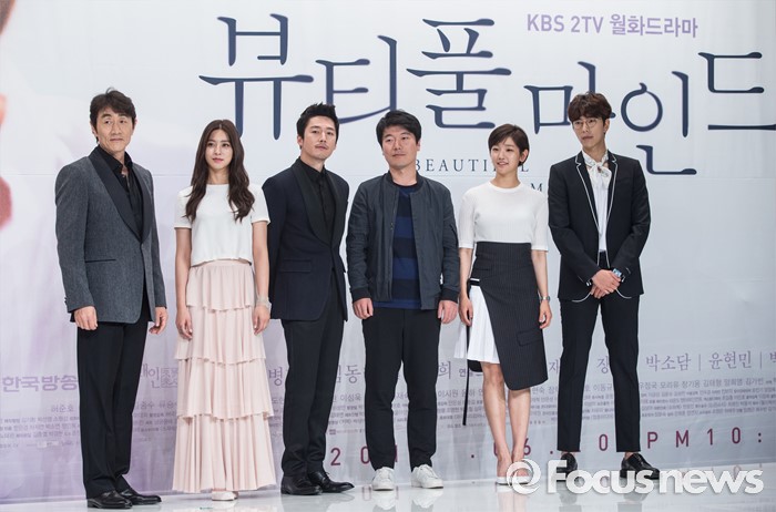 (서울=포커스뉴스) 14일 오후 서울 영등포구 타임스퀘어 아모리스홀에서 열린 KBS 2TV 월화드라마 '뷰티풀 마인드' 제작발표회에 참석한 출연진이 포토타임을 갖고 있다. 왼쪽부터 배우 허준호, 박세영, 장혁, 모완일 감독, 박소담, 윤현민.