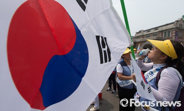 (서울=포커스뉴스) 14일 오후 서울역광장에서 열린 '북핵 규탄 및 평화통일 기원대회'에 참가한 한국자유총연맹 회원들이 태극기를 들고 있다.