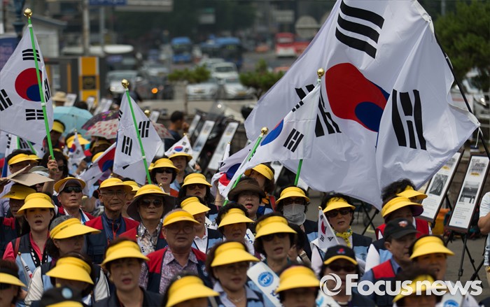 (서울=포커스뉴스) 14일 오후 서울역광장에서 열린 '북핵 규탄 및 평화통일 기원대회'에 참가한 한국자유총연맹 회원들이 태극기를 들고 애국가를 부르고 있다.