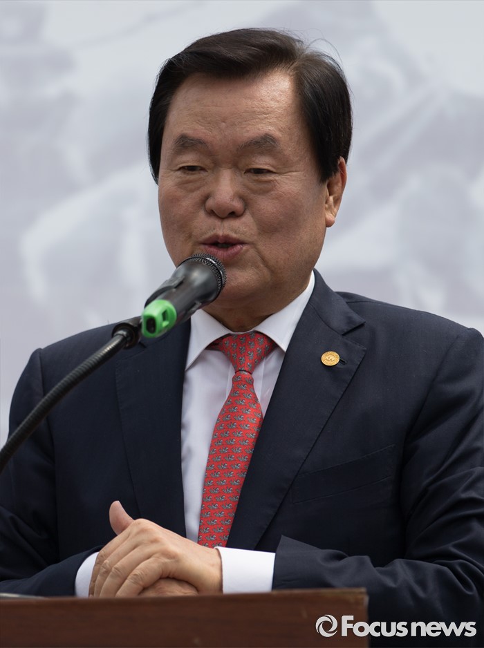 (서울=포커스뉴스) 14일 오후 서울역광장에서 열린 '북핵 규탄 및 평화통일 기원대회'에 참석한 김경재 한국자유총연맹 중앙회장이 인사말 하고 있다.