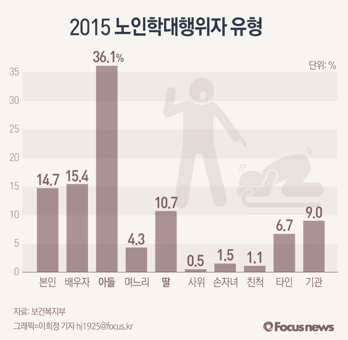(서울=포커스뉴스) 14일 보건복지부가 발간한 ‘2015 노인학대 현황보고서’에 따르면 노인 학대 사건 10건 가운데 5건은 자녀가 가해자인 것으로 조사됐다. 학대행위자는 아들(1523명, 36.1%), 배우자(652명, 15.4%), 딸(451명, 10.7%), 며느리(183명, 4.3%) 순이었다.