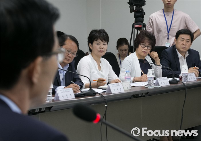 (서울=포커스뉴스) 14일 오후 서울 여의도 국회에서 열린 맞춤형 보육 관련 당정간담회에 참석한 정광진(오른쪽 첫번째) 한국어린이집총연합회장과 의원들이 방문규 보건복지부 차관의 발언을 듣고 있다.