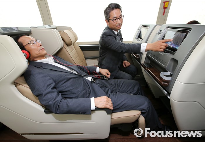 (세종=포커스뉴스) 프리미엄 고속버스 도입에 앞서 시승행사가 14일 오전 세종시 정부세종청사 제2주차장에서 열렸다. 최정호 국토교통부 2차관이 관계자로부터 기아자동차 뉴 그랜버드 프리미엄 골드 익스프레스 설명을 듣고 있다.