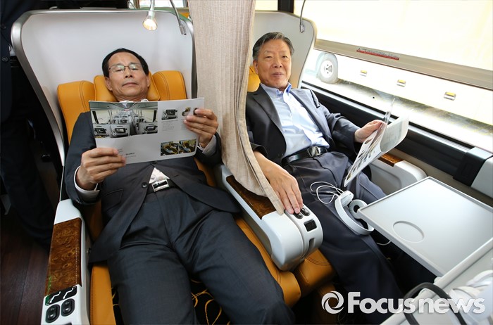 (세종=포커스뉴스) 프리미엄 고속버스 도입에 앞서 시승행사가 14일 오전 세종시 정부세종청사 제2주차장에서 열렸다. 최정호 국토교통부 2차관이 관계자로부터 현대자동차 21인승 프레스티지 유니버스에 대한 설명을 듣고 있다.