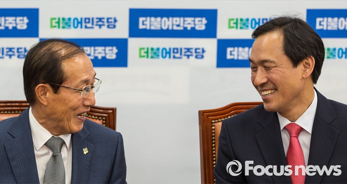 (서울=포커스뉴스) 우상호(오른쪽) 더불어민주당 원내대표가 14일 오후 서울 여의도 국회에서 이원종 대통령비서실장과 면담하고 있다.