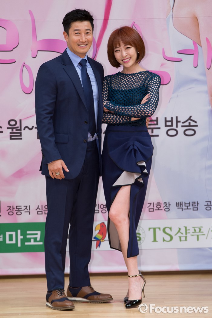 (서울=포커스뉴스) 14일 오후 서울 양천구 SBS 목동사옥에서 열린 SBS 일일드라마 '사랑이 오네요' 제작발표회에 참석한 배우 이훈(왼쪽)과 심은진이 포토타임을 갖고 있다.