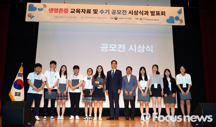 (세종=포커스뉴스) 이준식 부총리 겸 교육부 장관이 14일 오후 세종시 정부세종청사 15동 대강당에서 열린 생명존중 교육자료 및 수기공모전 시상식에서 수상자들과 기념촬영하고 있다.