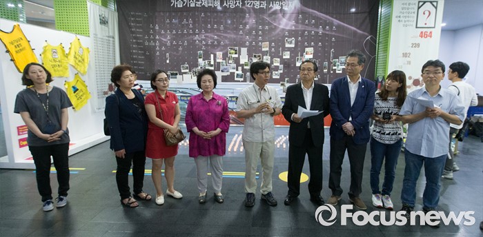 (서울=포커스뉴스)14일 오후 서울 중구 서울시민청에서 열린 '2000일간의 기록-가습기살균제 피해 사진전' 개전식에 참석한 가습기살균제 피해자와 가족모임과 환경보건시민센터 관계자들이 기자회견을 하고 있다. 이번 전시는 23일까지 열리며 가습기살균제 피해자 사진과 항의행동 기록, 희생자에 대한 추모 기록 등이 전시된다.